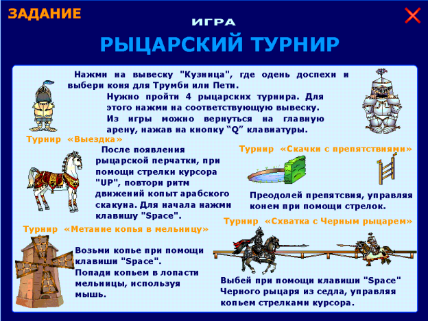 В этой игре предусмотрено четыре вида соревнований: музыкальное - "Соревнование с арабским скакуном", направленное на тренировку ритмического слуха; "Скачки с препятствиями"; "Бой с ветряной мельницей", и "Стычка с Чёрным рыцарем".