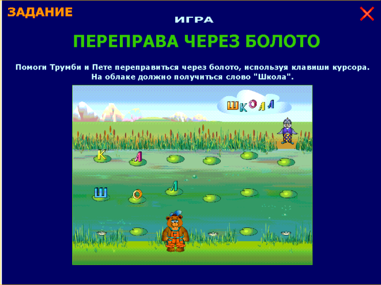 В данной игре, чтобы пеправиться на лругой берег, правильно ориентируясь, нужно следить за возможностью прыжков, последовательно собирая слово школа из букв, расположенных на листьях. Если на первых порах начинаешь тонуть, не стоит слишком волноваться, ведь на помощь всегда поспешит мудрый Крукос и спасет.